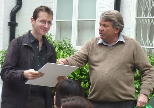 Those of us who have been on board for the long and recently successful haul towards buying the freehold for Maybury Court very much wanted to say thank you to Alistair. Not only for captaining the ship and stopping us jumping overboard in frustration at all the obstacles, but for patiently and skilfully navigating the choppy and cut-throat waters of Dewaldenland and coming out the other side with us on board! Peter had organised a way of showing our appreciation of Alistair's unstinting efforts on our behalf, and the garden party seemed the fitting place to present Alistair with a token to "mark the spot" until he has chosen the painting(s) we are to buy for him.